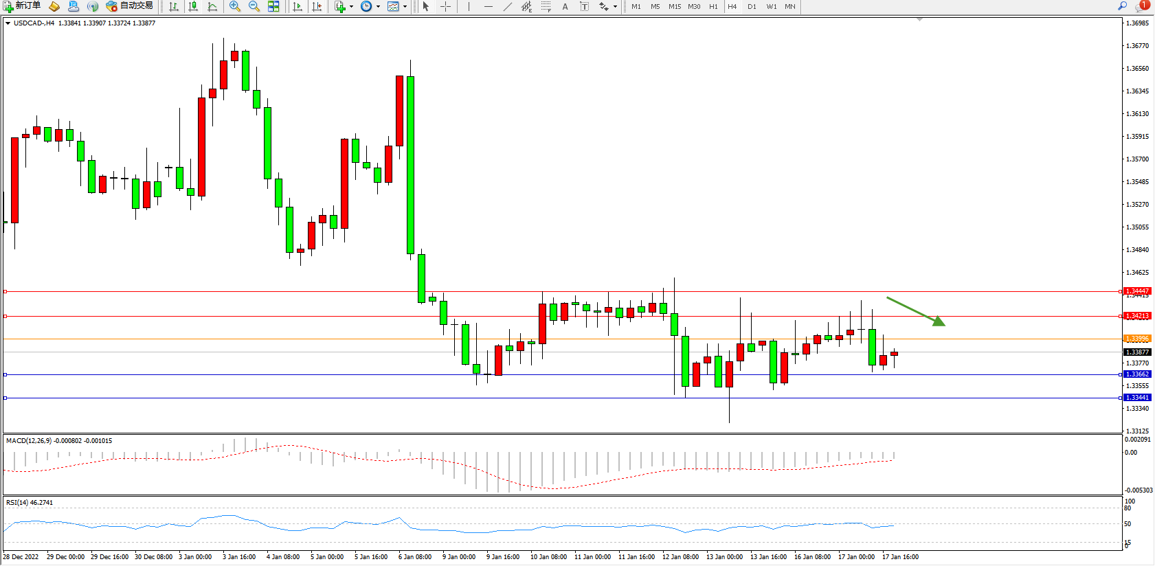 美元加元USDCAD——4小时K线图显示: