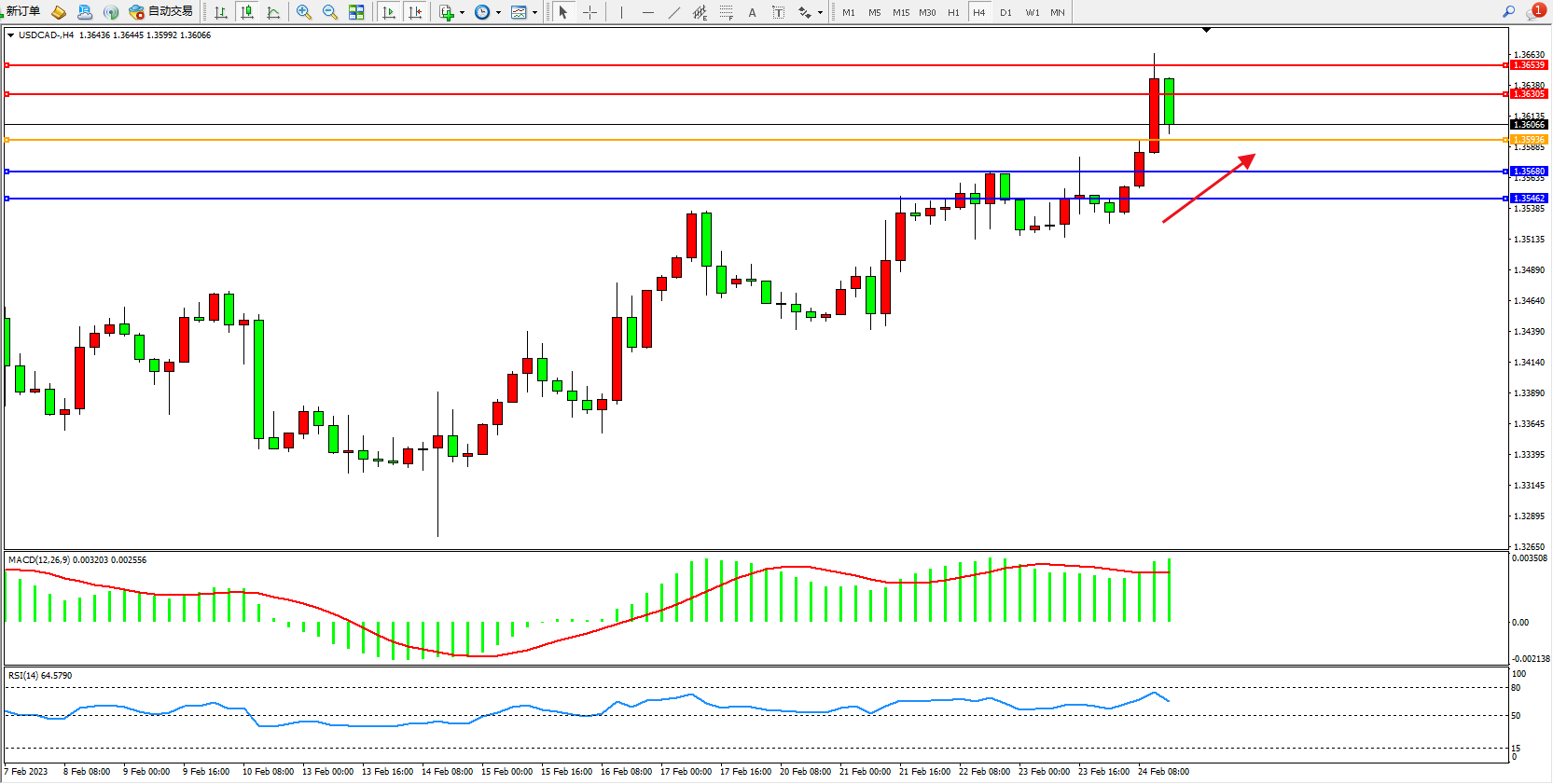 美元加元USDCAD——4小时K线图显示: