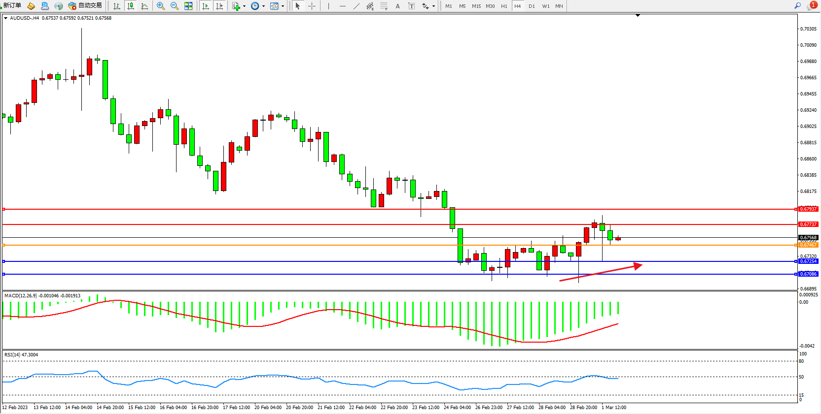 交易策略:0.67467上方看涨,目标0.67737、0.67937