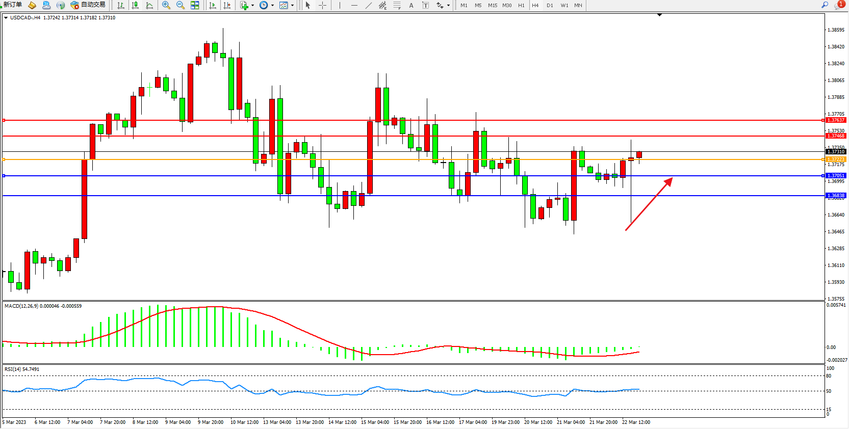 美元加元USDCAD——4小时K线图显示: