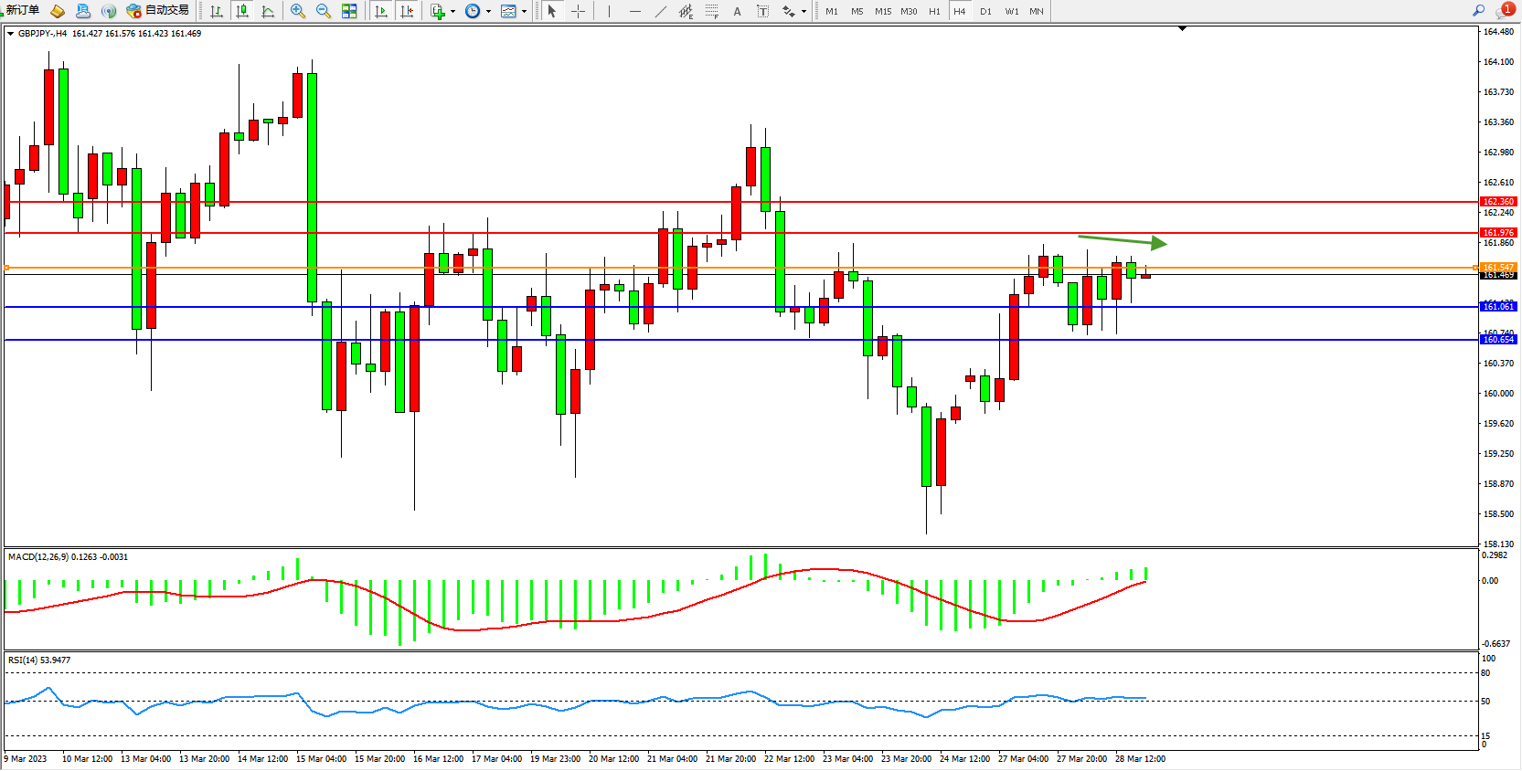 交易策略:161.469下方看跌,目标161.061  160.654