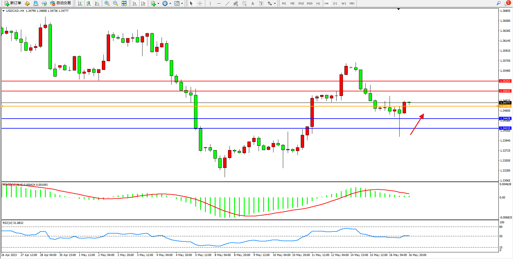 美元加元USDCAD——4小时K线图显示: