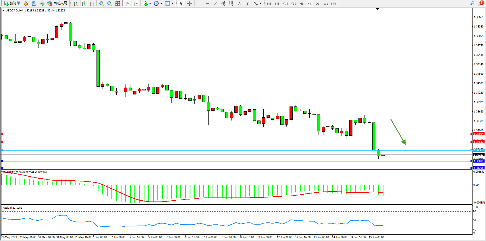 美元加元USDCAD——4小时K线图显示: