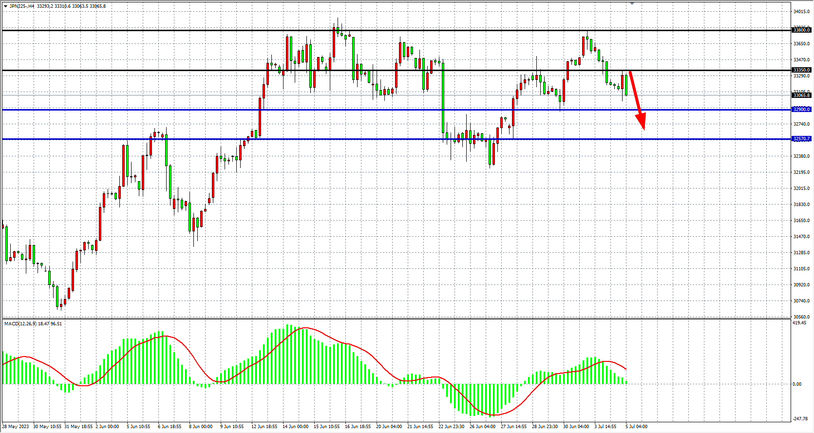 4小时图看,日经指数在33350附近继续受阻,MACD量能即将下穿零轴,行情继续走回调,阻力关注33350-33800,支撑关注32600。