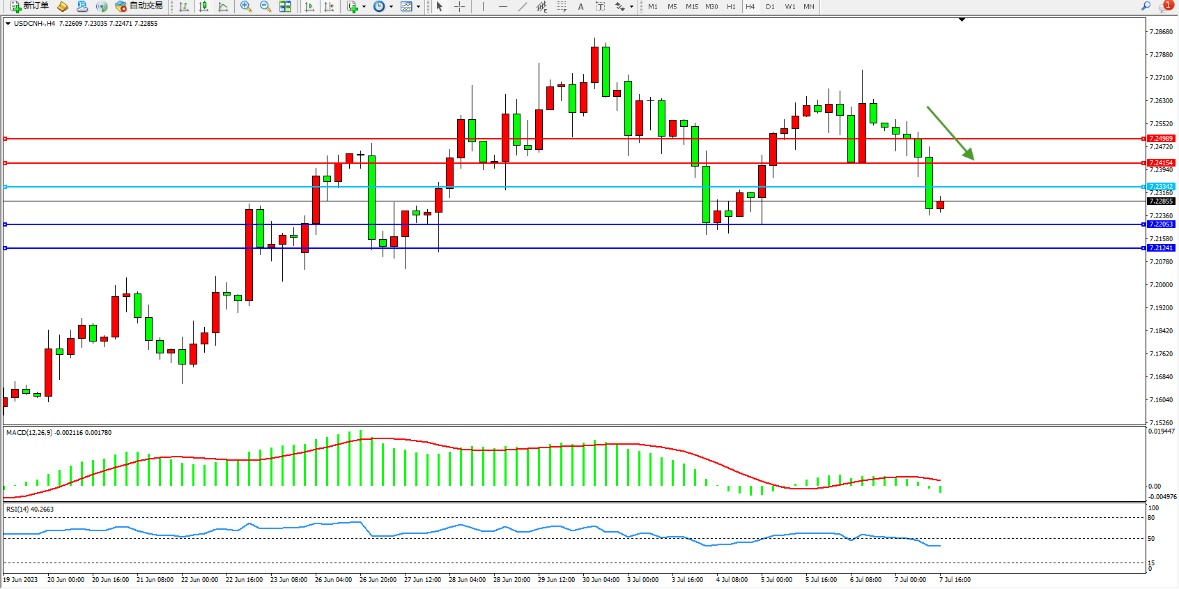 交易策略:7.23242下方看跌,目标7.22053  7.21241