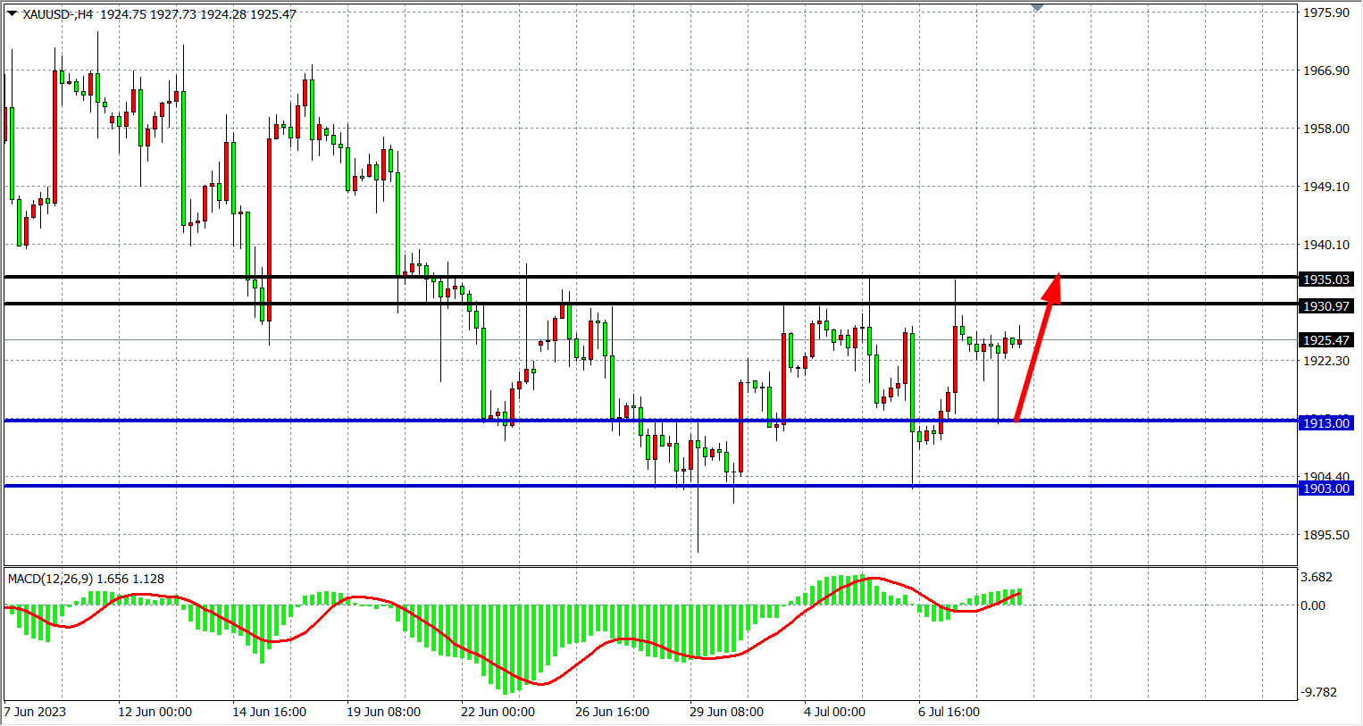 4小时图看,黄金盘中一度下挫至1913美元附近后迅速收回,全天维持震荡,MACD量能在零轴上运行,行情持续宽幅整理,阻力关注1930-1935,支撑关注1913-1903。