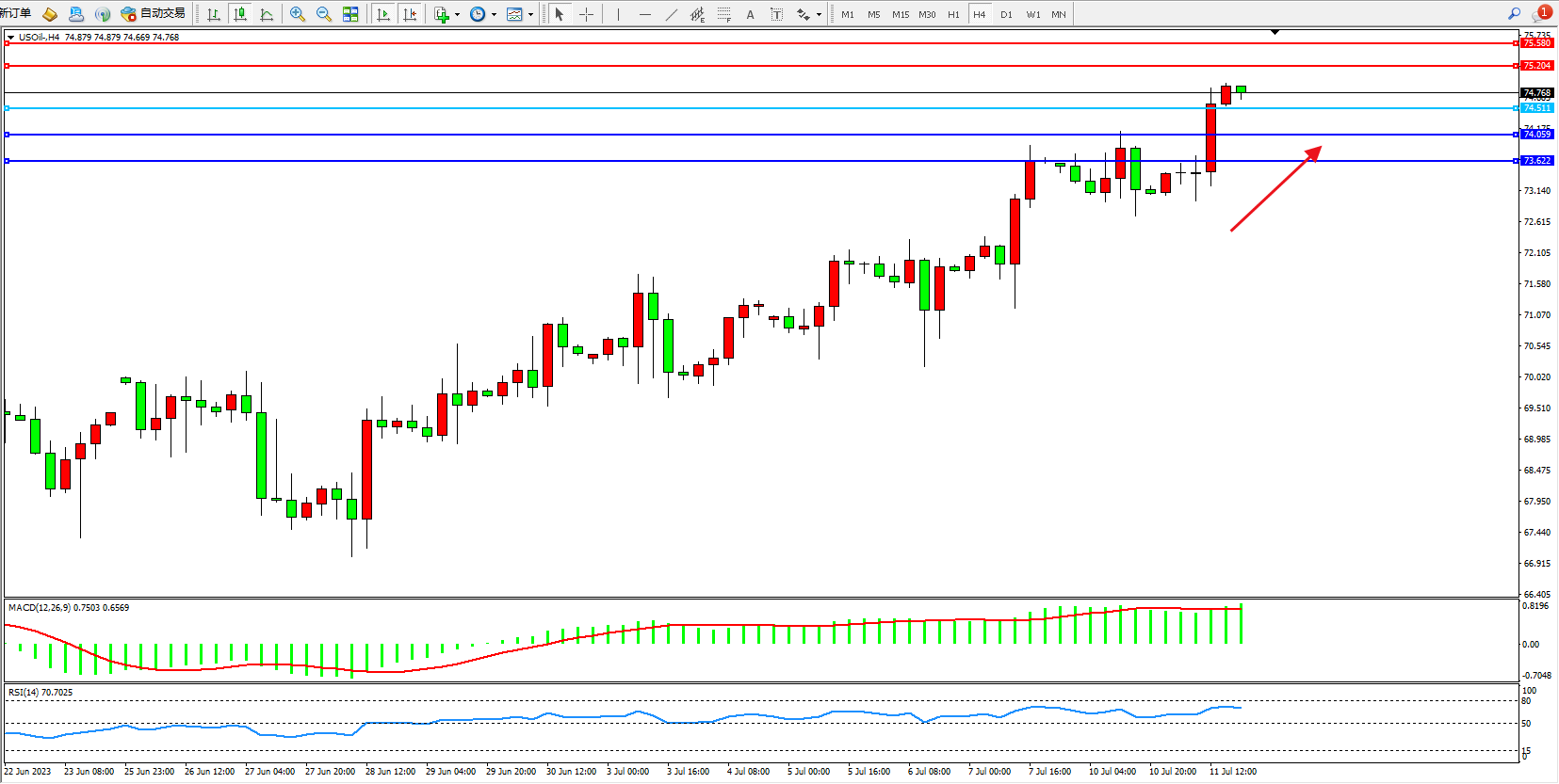 交易策略:74.811上方看涨,目标75.204 75.580