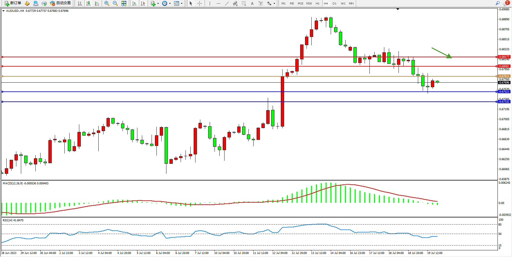 交易策略:0.67811下方看跌,目标0.67523  0.67332