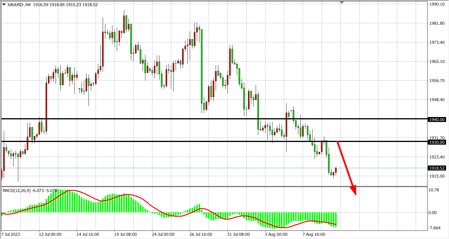 4小时图看,黄金进一步回落至1920下方,MACD量能维持零轴下,走势延续空头行情,阻力继续关注1930-1940附近,支撑关注1900关口。