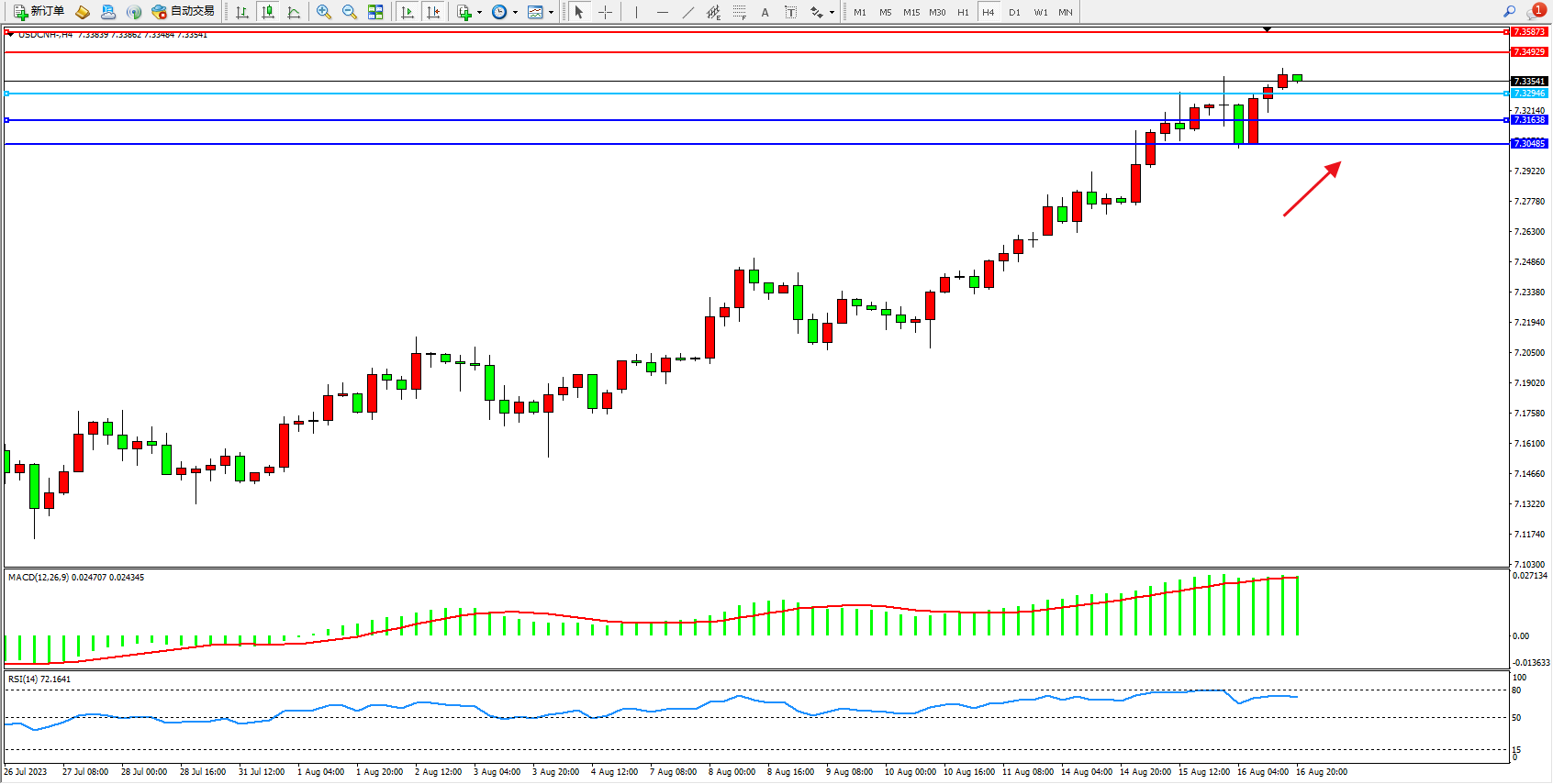 美元人民币USDCNH——4小时K线图显示: