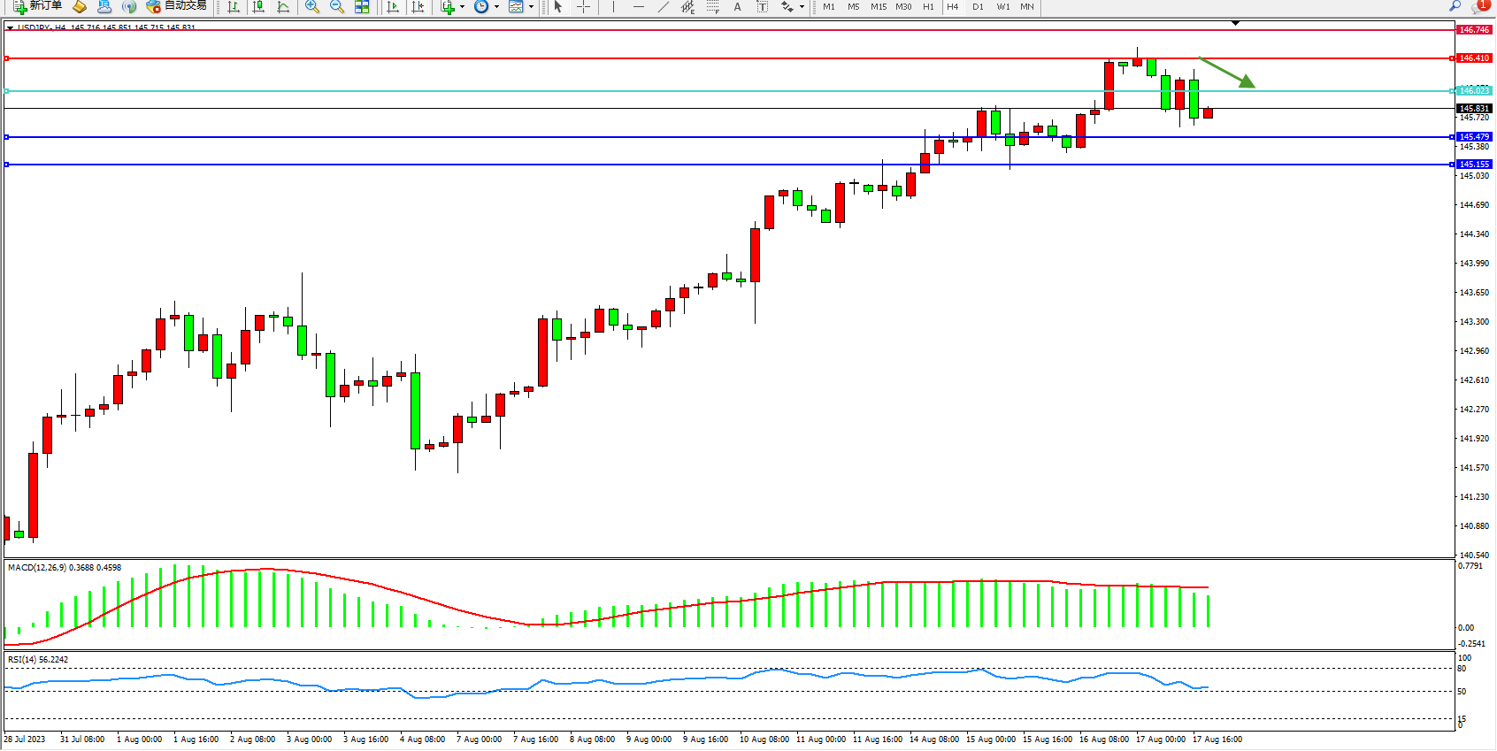 交易策略:146.023下方看跌,目标145.479 145.155