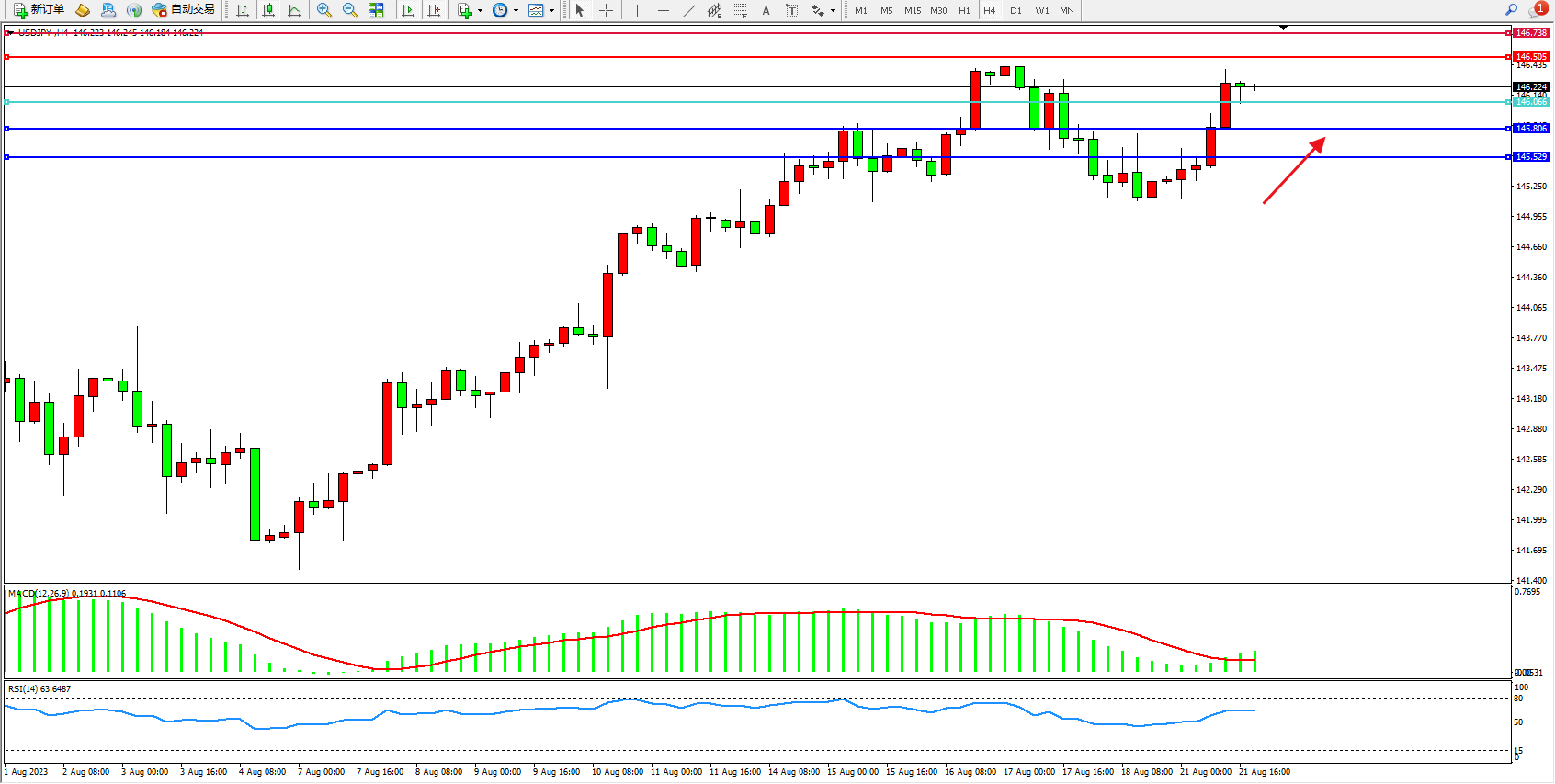 交易策略:146.066上方看涨,目标146.505  146.739