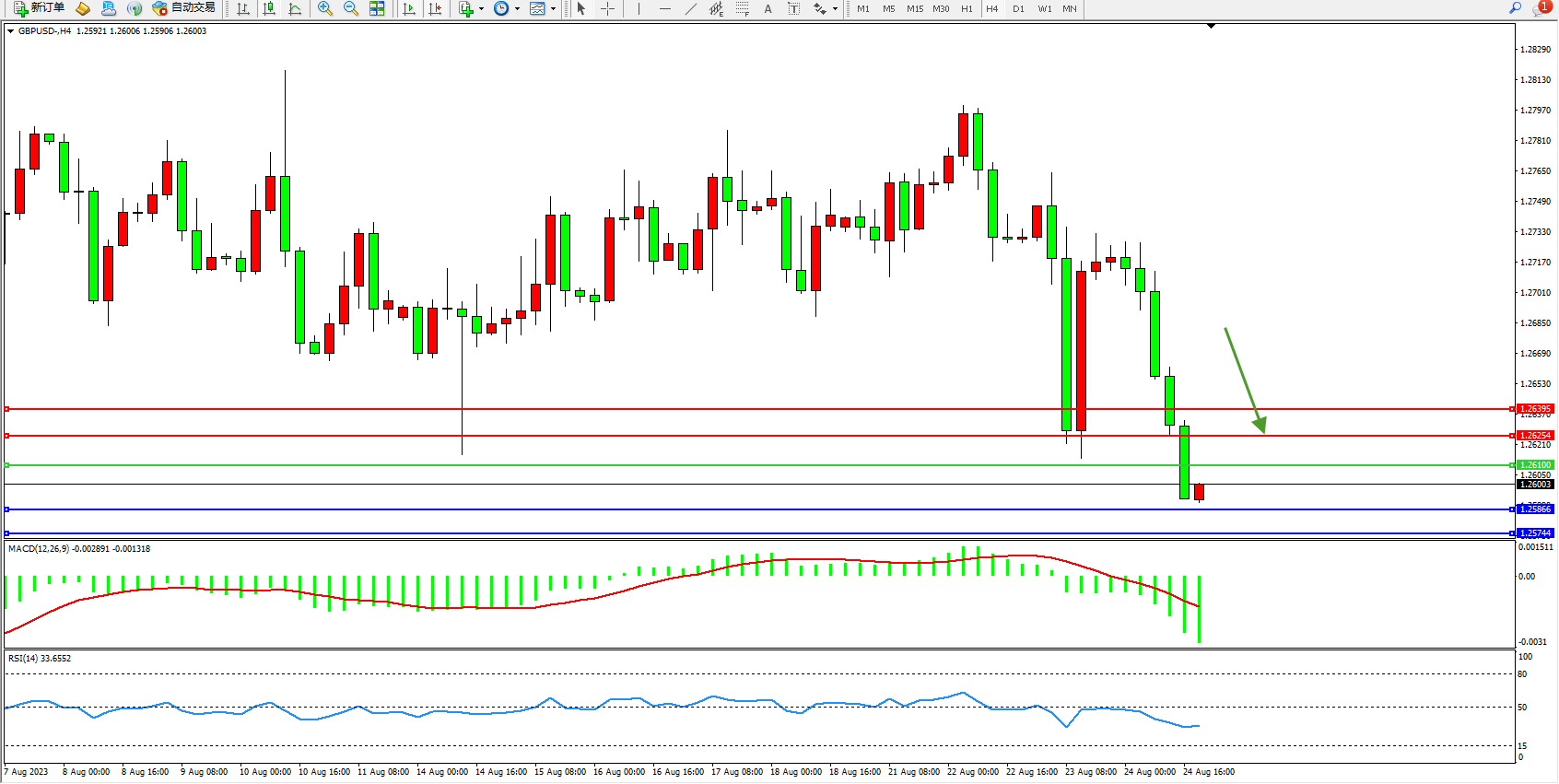 交易策略:1.26100下方看跌,目标1.25866  1.25744