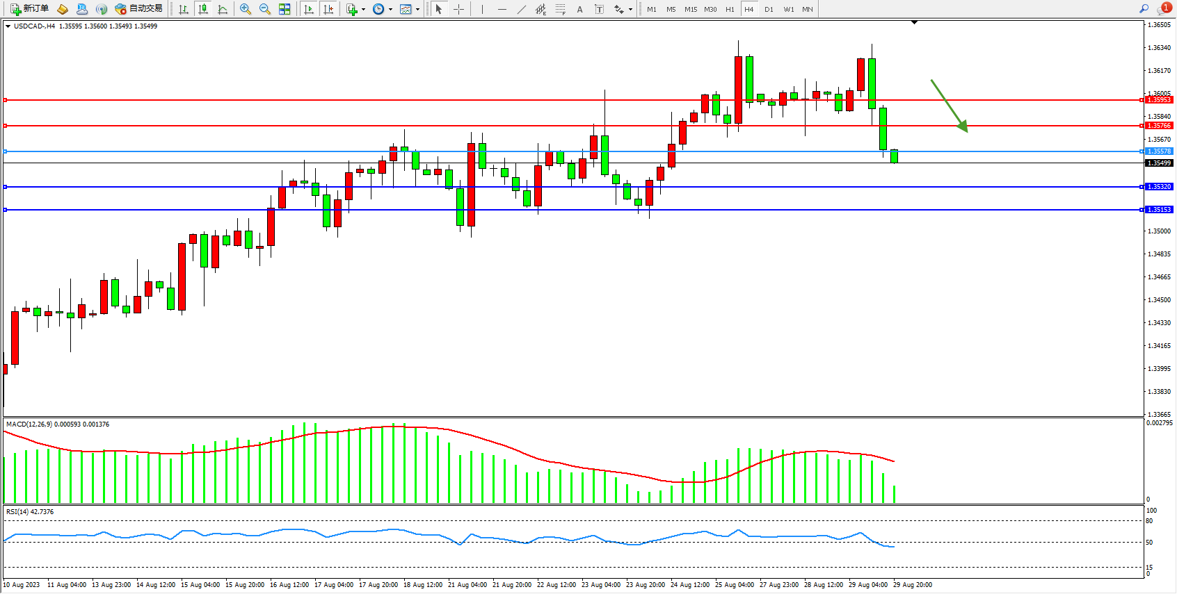 美元加元USDCAD——4小时K线图显示:
