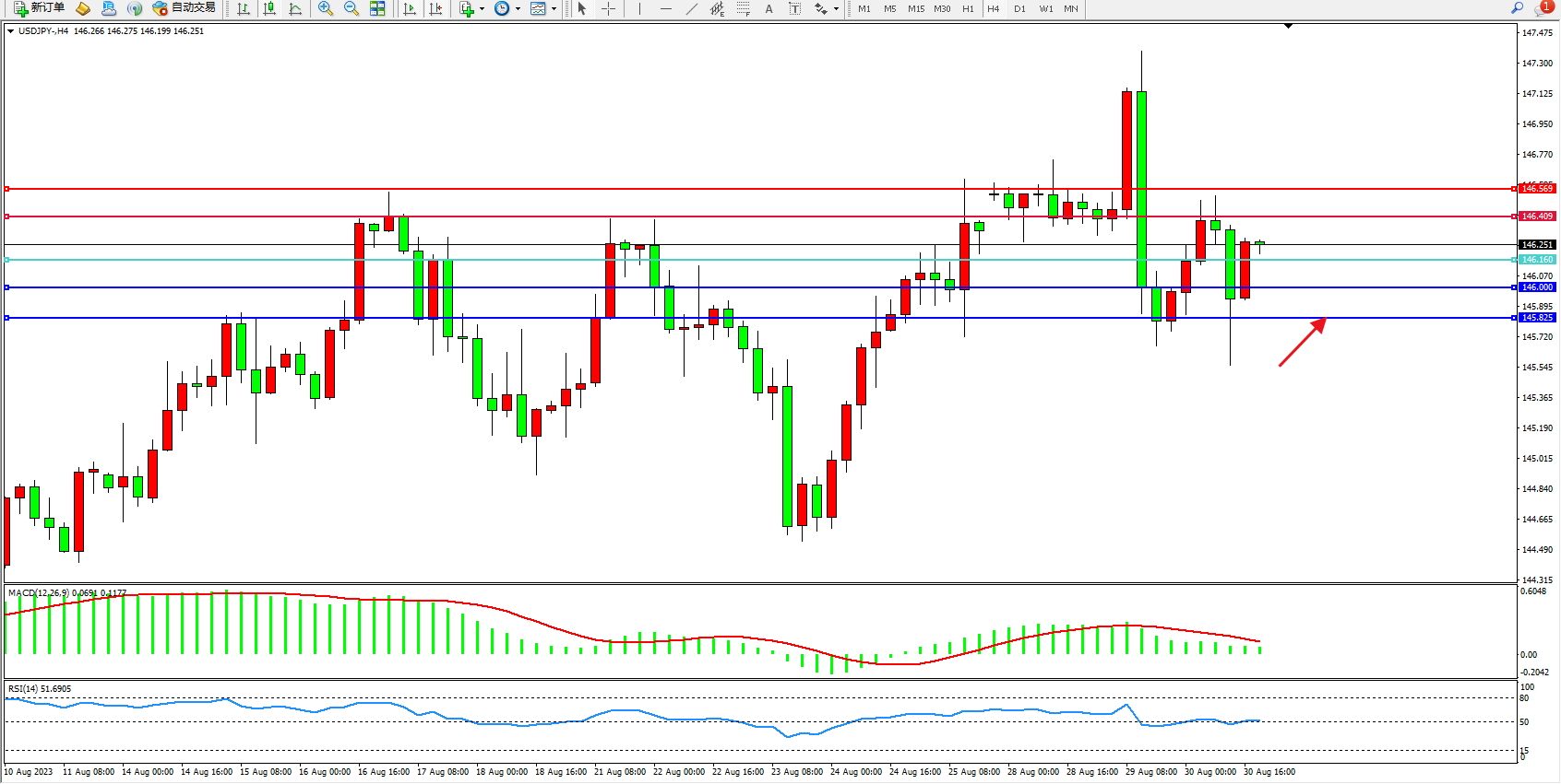 备选策略:146.160下方看跌,目标146.000 145.825