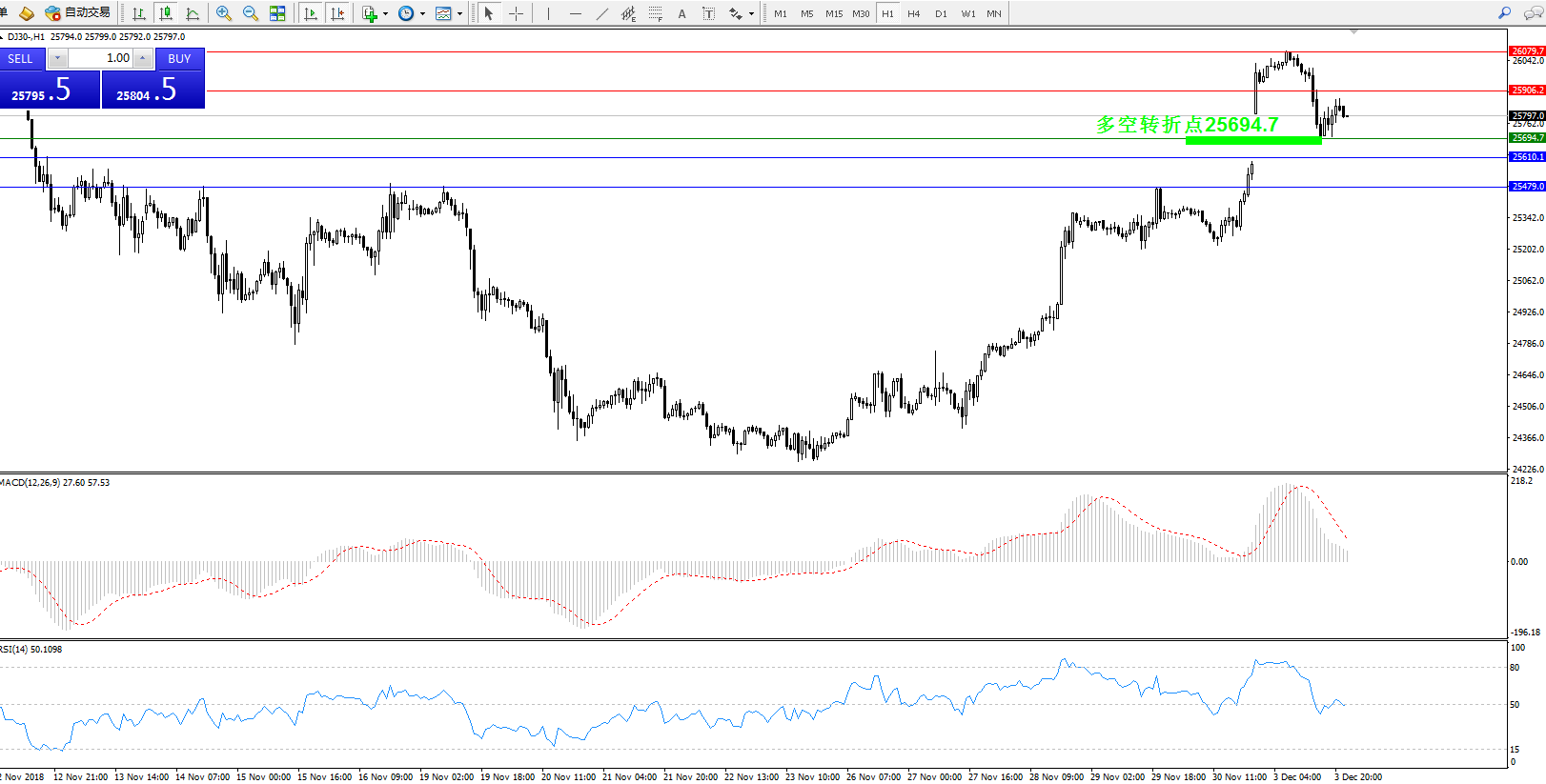 道琼斯指数DJ30—1小时K线图显示: