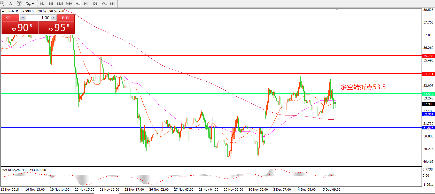 交易策略:在53.5之上看涨,目标54.70   55.80