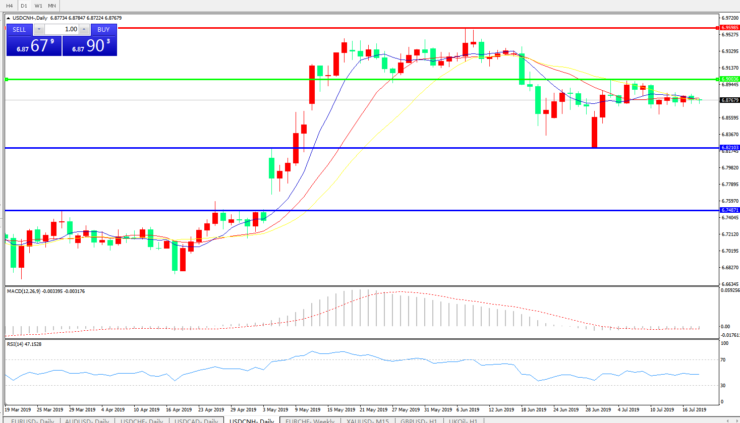 技术面简析:日图均线继续粘合无方向,MACD徘徊在0轴附近且动能柱若隐若现,RSI趋于走平,预计短期汇价将继续整理或向下修正,中期关注6.90附近多空转折区域压制是否有效及中美贸易谈判最新进展。