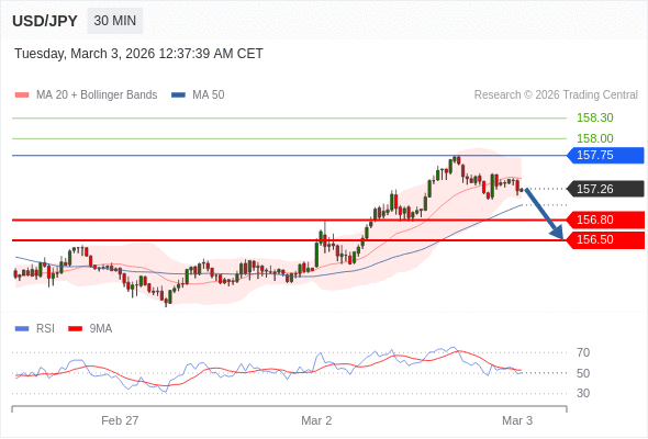 在 157.75 之下,看跌,目标价位为 156.80 ,然后为 156.50 。