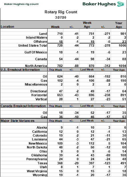 另外,路透报道,Cowen & Co公司说对28家独立的上游勘探开发公司的资本开支跟踪显示,2020年的资本支出已经减少了37%。在价格战之前,28家公司2019年在削减了10%的资本支出基础上,2020年的资本支出预计再削减11%。资本支出的减少,直观的数据可以通过钻机数量的下降佐证,目前的钻机下降速度可能将超出机构的原来预期。毕竟价格是无情的大杀器。Simmons Energy公司认为2020年钻机数量将减少到平均528台,2021和2022将达到215和221台,较之前预计的943/816/848台大幅减少。