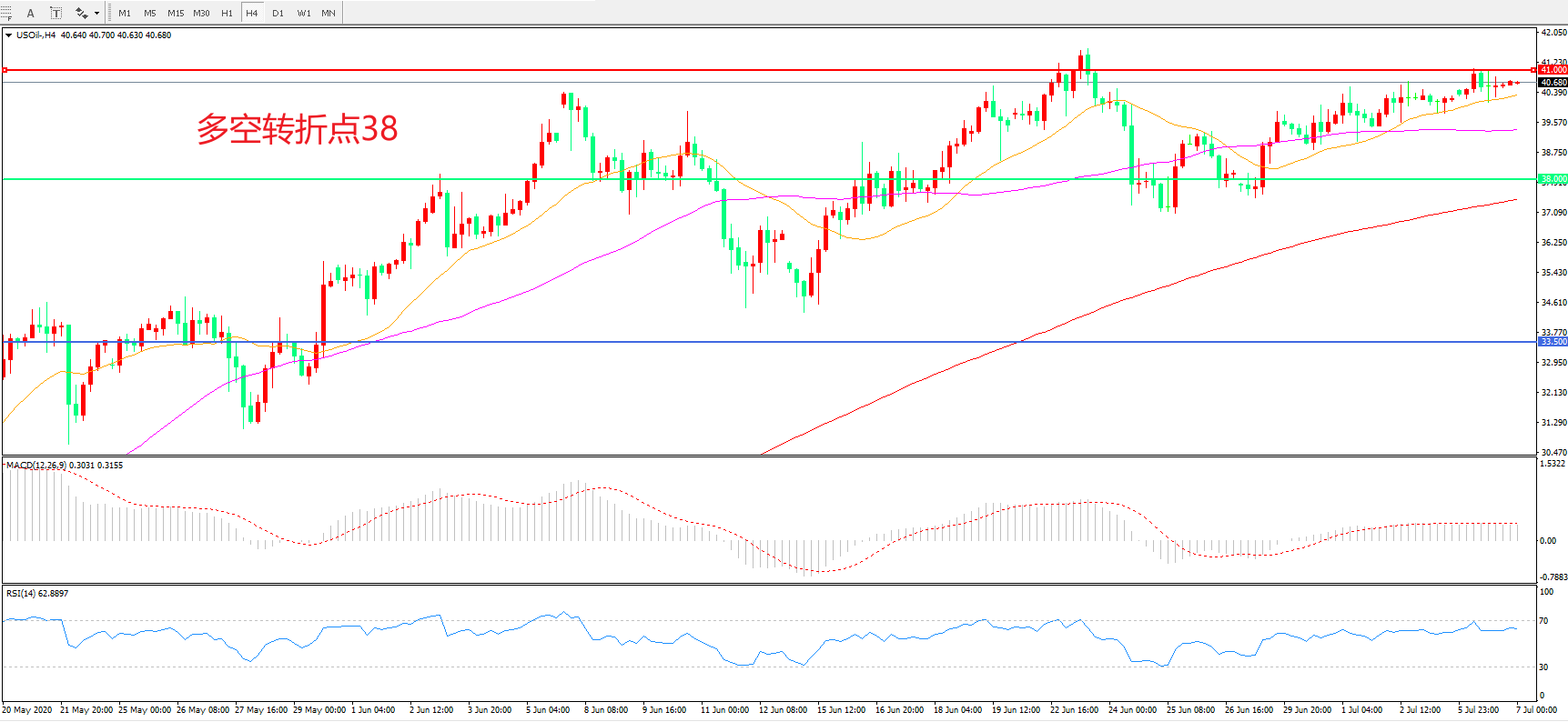 4小时图看,油价延续高位震荡,整体波幅不大,55周期均线成为短期支撑,41成为短期阻力,MACD红柱增加,RSI指标走平,日内延续震荡概率较大。