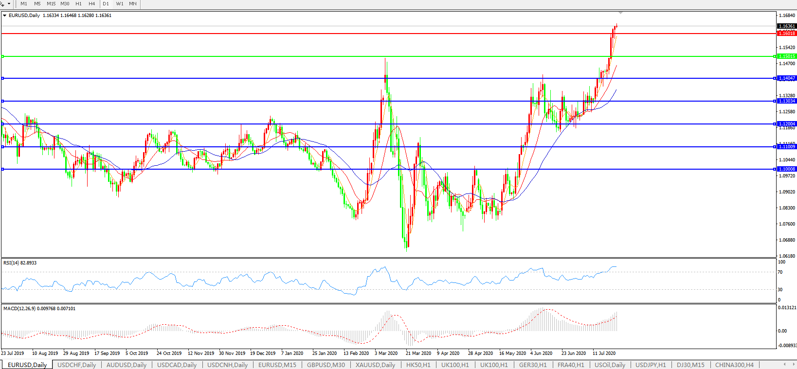 欧元兑美元触及22个月高点1.1658,连续第五周上涨,尾盘升0.52%,报1.1656;调查显示,欧元区企业活动7月恢复增长,因经济中有更多曾封锁的部分重新开放,消费者也走出家门回到工作岗位或消费。Markit首席经济学家Chris Williamson:随着企业封锁继续放松,经济重新开放,欧元区7月份的产出增幅达到了两年多来的最高水平。需求也显示出复苏的迹象,帮助抑制了失业的步伐;数据进一步表明,在经历了第二季度前所未有的崩盘之后,欧元区经济应该会出现强劲反弹。欧元区范围内企业报告称第三季度录得好的开端,随着疫情封锁放松、经济重开,7月产出增速为逾两年最快。需求有回暖迹象,帮助缓解就业岗位流失。