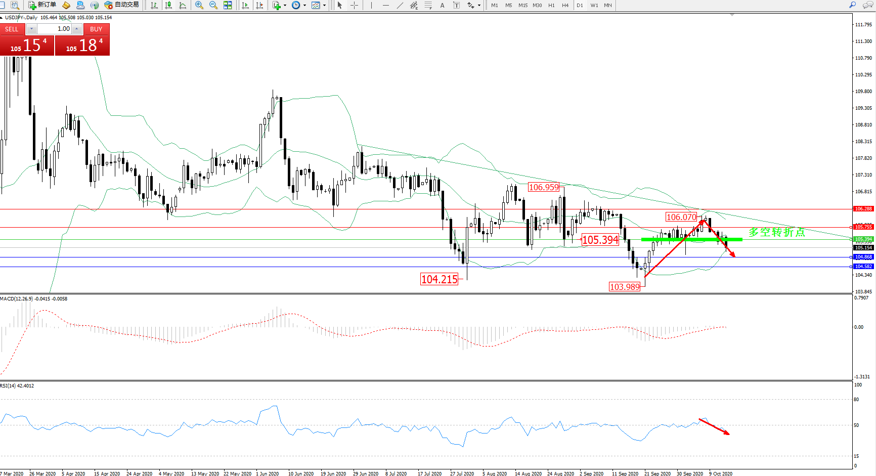 交易策略:105.394下方看跌,目标104.868、104.582