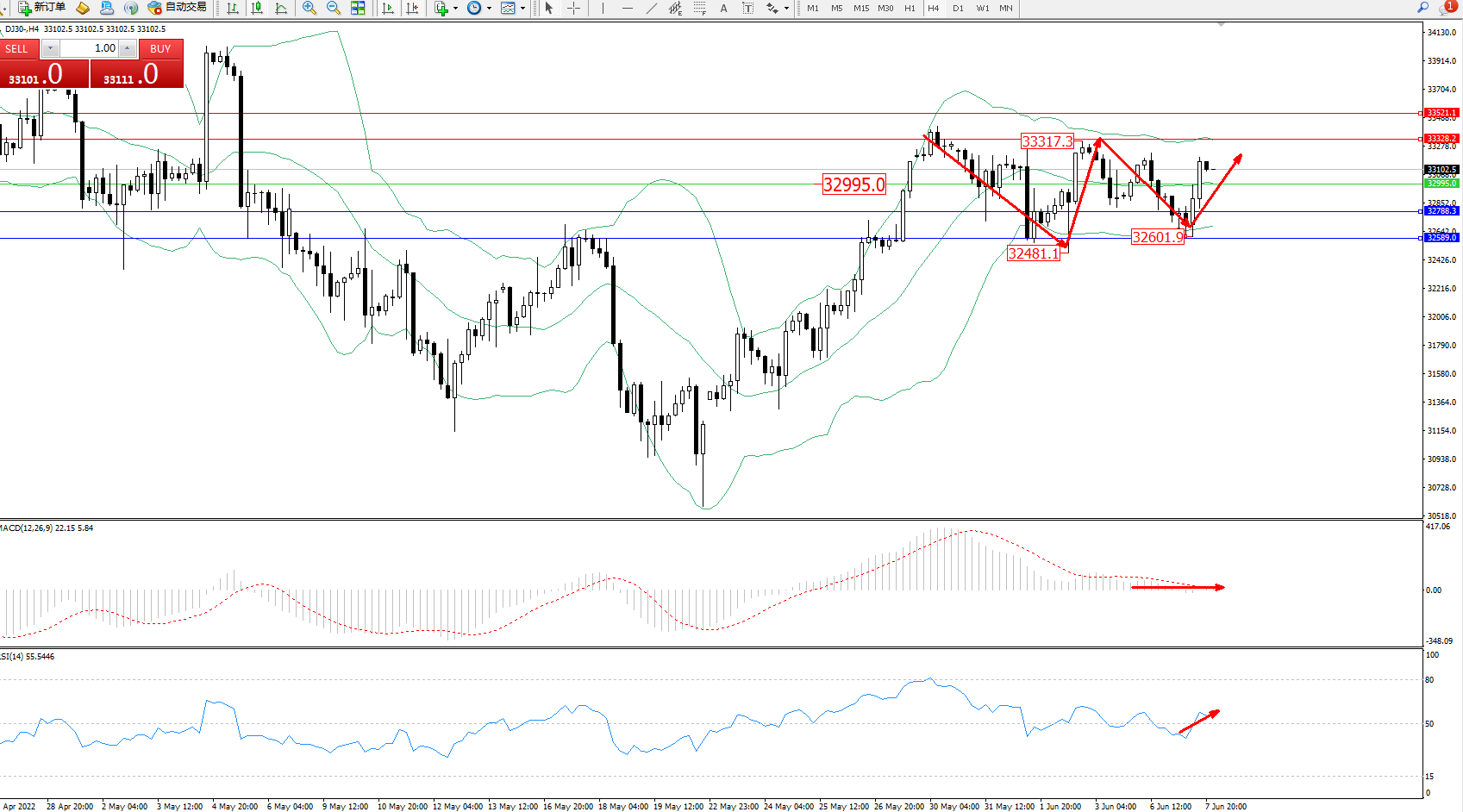 交易策略:32995上方看涨,目标33328、33521