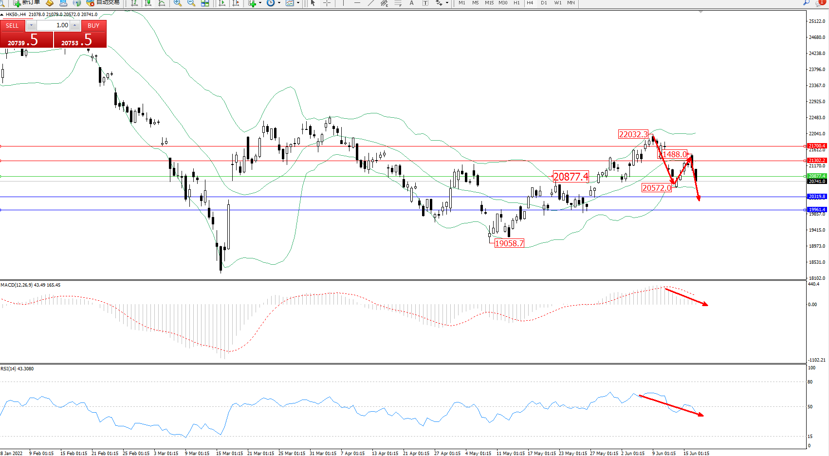 恒指HK50 ——4小时K线图显示: