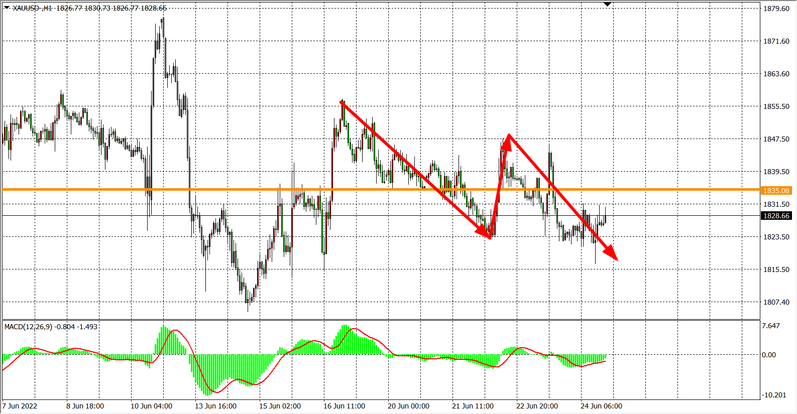 交易策略:在1835.00之下看跌,目标1815.00          1800.00