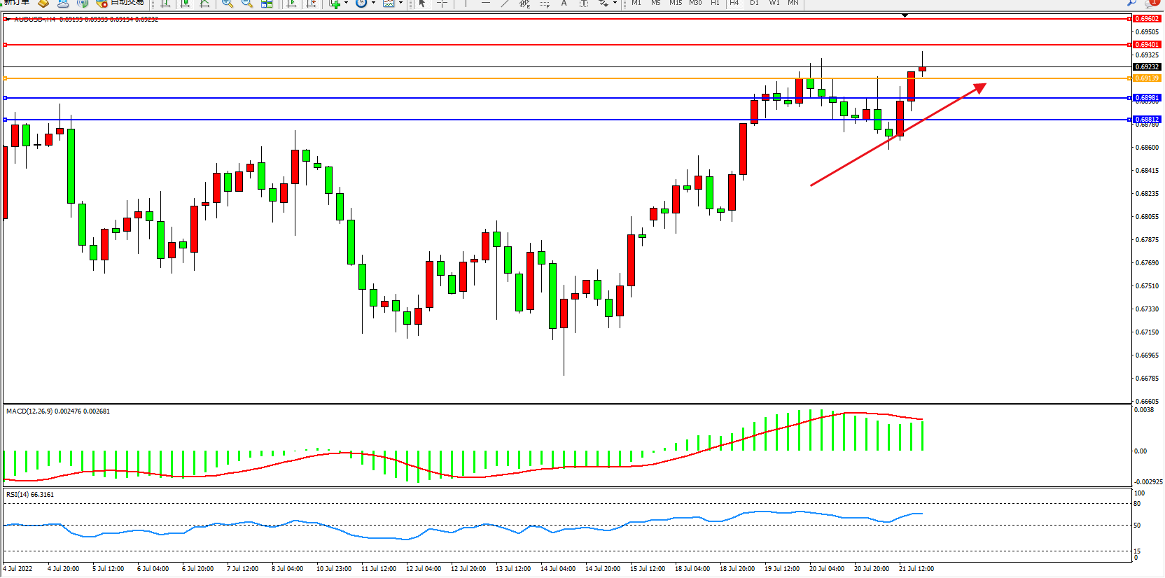 澳元美元AUDUSD——4小时K线图显示: