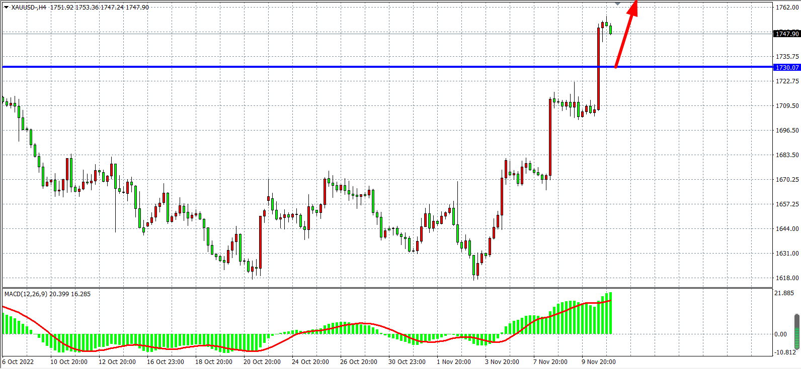 周四(11月10日)美国10月未季调CPI年率录得7.7%,低于预期的8%,美元指数短线跳水失守109,现货黄金站上1750美元