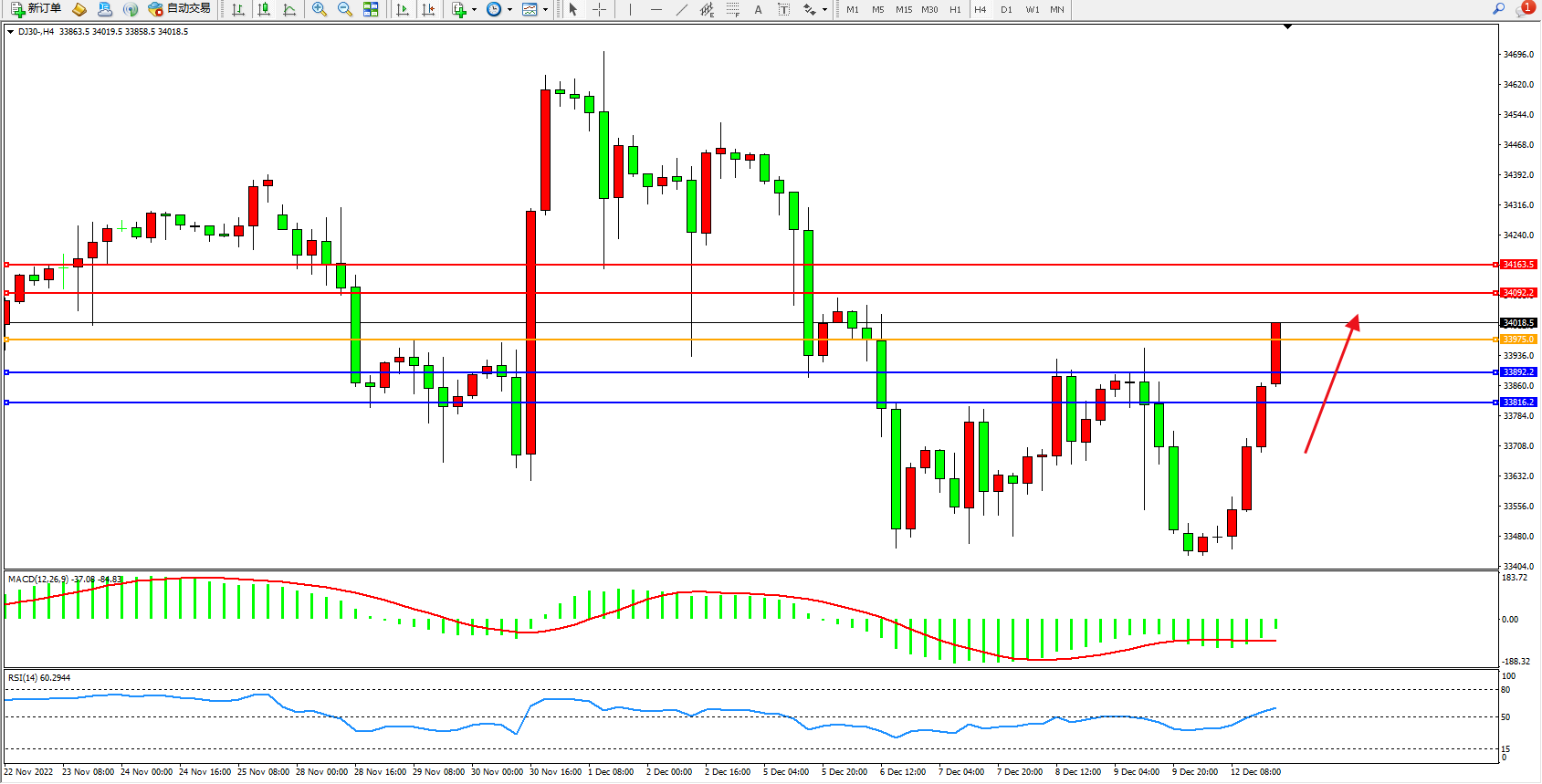 道琼斯指数DJ30——4小时K线图显示: