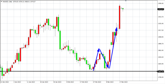 这波大跌也是继黄金前一阶段(2月27日-3月3日)上涨波段形成的修正,最终在1805一线获得了支撑,开启强势反弹,迎来“第三浪”的上攻主升行情。